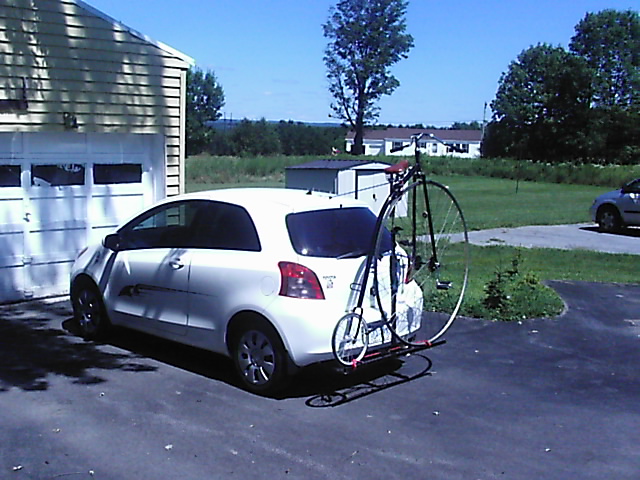 Riding hiwheel bicycles can be a fun and relaxing endeavor. However, the large size of the bikes, while impressive, can make it difficult to tranport them to your chosen riding location. Below are a few examples of our customers' solutions. (These images can also be found in the Customer Photos section.) Click the thumbnail images to enlarge: